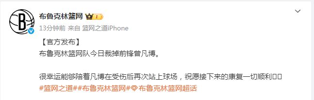 “布鲁克林篮网队今日裁掉前锋曾凡博。很幸运能够陪着凡博在受伤后再次站上球场,祝愿接下来的康复一切顺利。”